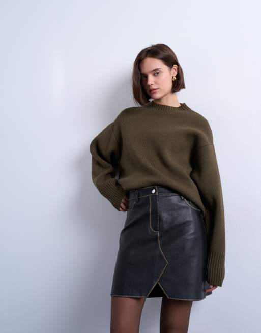 Topshop - Minigonna in pelle sintetica marrone scuro slavato stile denim con davanti a V