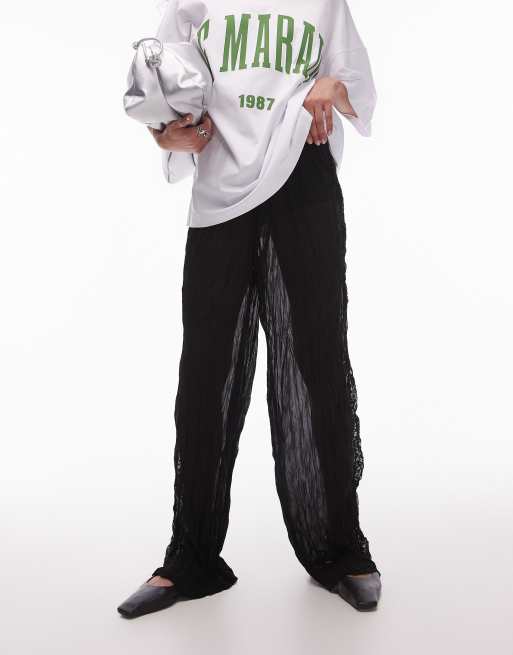 Topshop - Pantaloni a fondo ampio neri in misto pizzo stropicciato