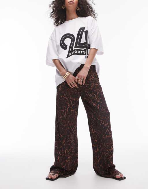 Topshop - Pantaloni dritti in raso con stampa leopardata scura allacciati in vita