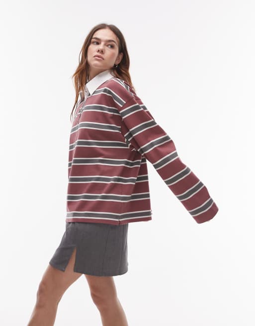 Topshop - Polo stile rugby a maniche lunghe bordeaux a righe