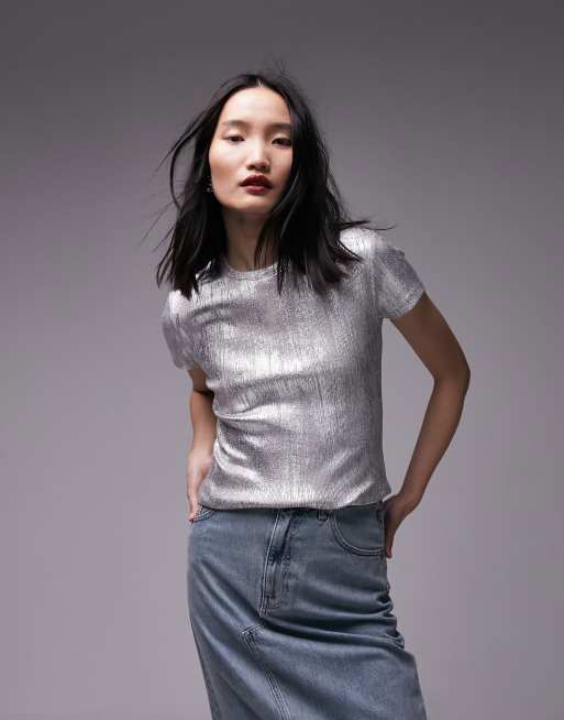 Topshop - T-shirt argento con stampa laminata