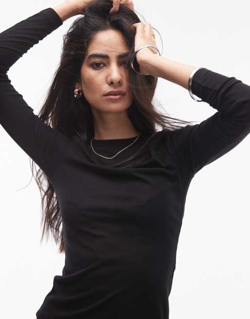 Topshop - Top a maniche lunghe girocollo premium nero trasparente