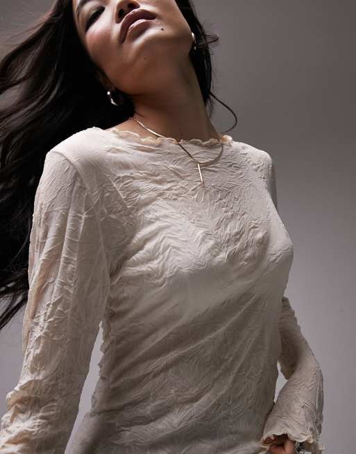 Topshop - Top a maniche lunghe rosa cipria in rete stropicciata