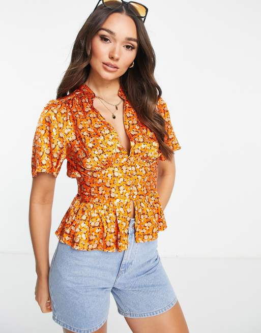 Topshop - Top da giorno con maniche a pipistrello in raso arancione con stampa di rose e bottoni