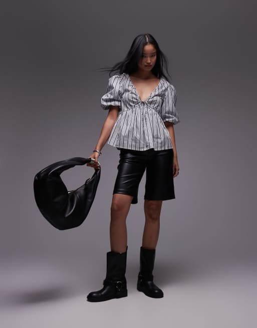 Topshop - Top in popeline monocromatico a righe con maniche a sbuffo