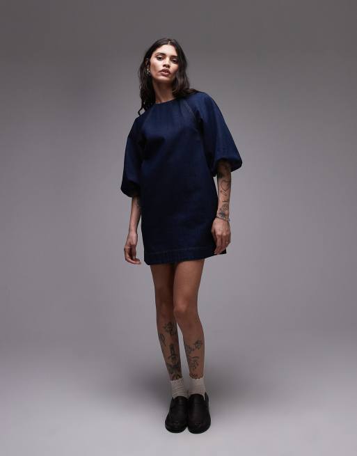 Topshop - Vestito a trapezio corto in denim indaco grezzo con maniche a palloncino