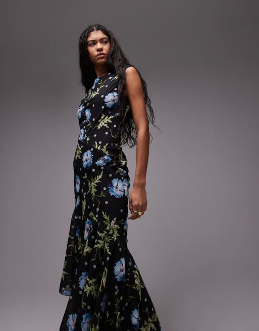 Topshop - Vestito boutique midi da cerimonia nero a fiori con fondo godet