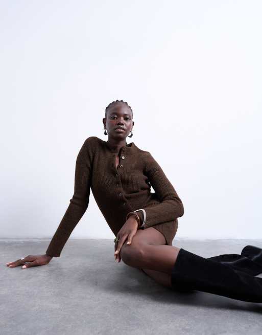 Topshop - Vestito corto girocollo in maglia cioccolato con bottoni