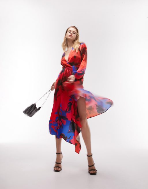 Topshop - Vestito da cerimonia midi rosso a fiori a portafoglio con fondo a cascata