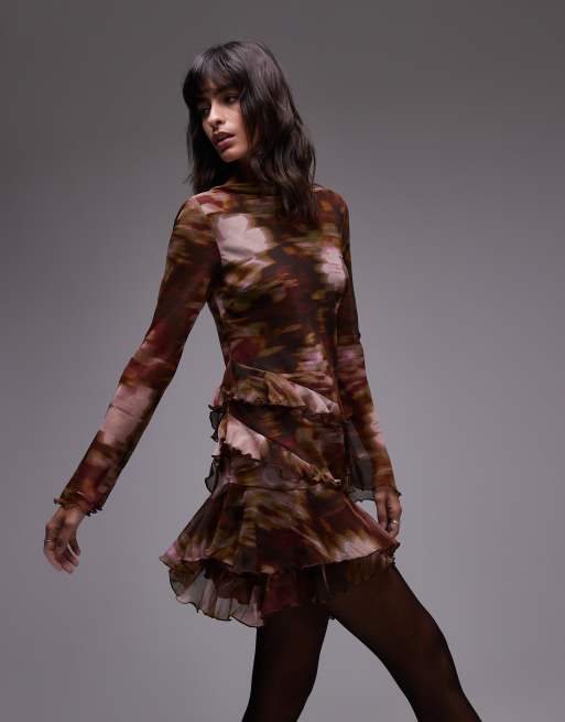 Topshop - Vestito da giorno con stampa sfocata a fiori e volant