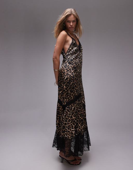 Topshop - Vestito lungo animalier con inserti in pizzo