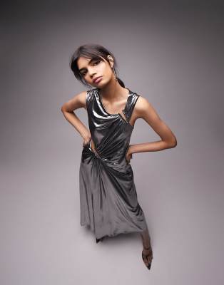 Topshop - Vestito midi asimmetrico argento metallizzato con cut-out