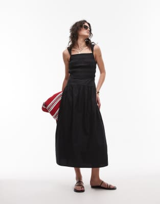 Topshop - Vestito midi in popeline nero con corpino arricciato