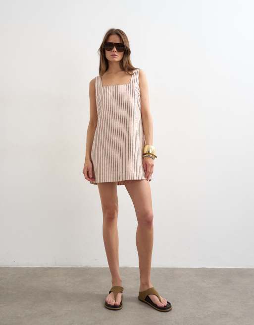 Topshop - Vestito scamiciato con scollo squadrato in denim écru e rosso a righe