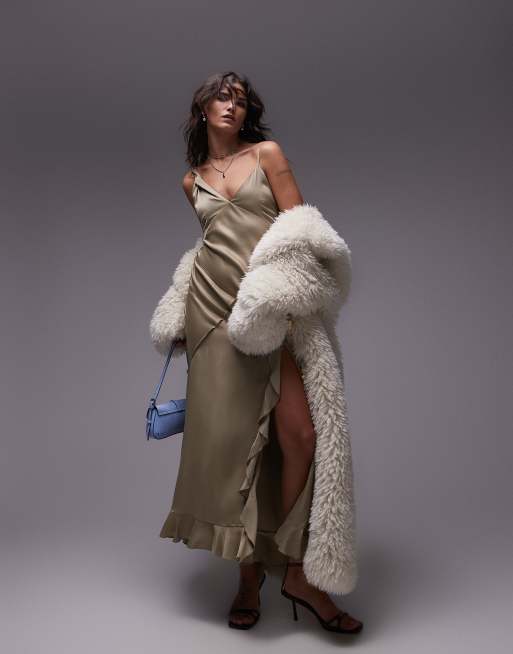 Topshop - Vestito sottoveste midi in raso oro tenue con cuciture a vista e spallina attorcigliata