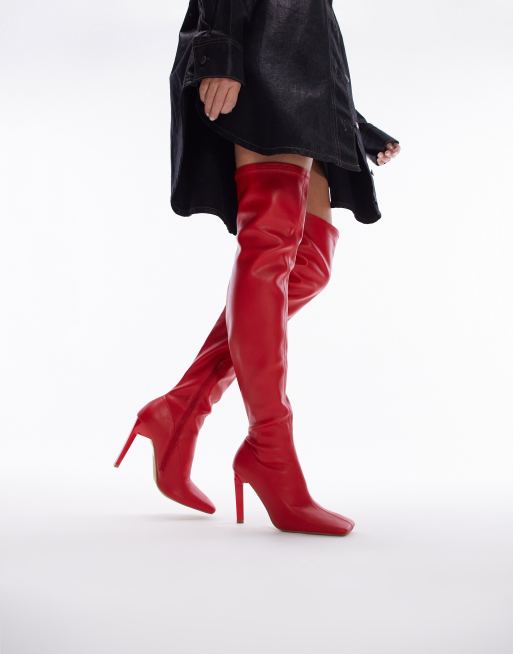 Topshop Wide Fit - Mollie - Stivali a calza sopra il ginocchio con tacco a pianta larga rossi