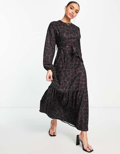 Trendyol - Vestito lungo bordeaux con stampa animalier e maniche lunghe