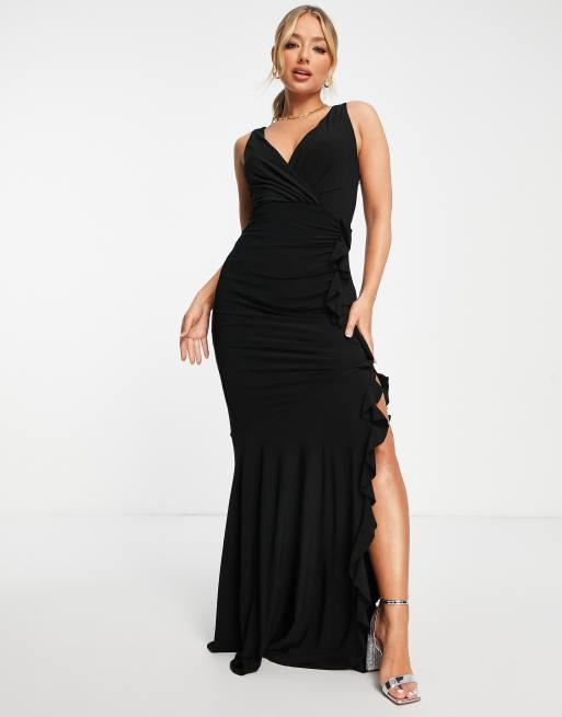 Trendyol - Vestito lungo nero con volant e lato scivolato