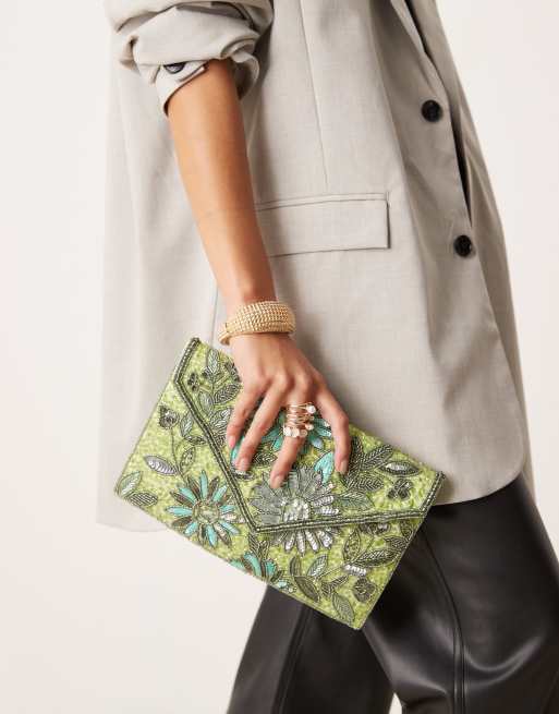 True Decadence - Pochette a busta verde con decorazione a fiori con paillettes
