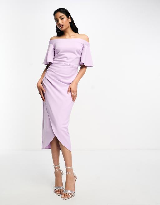 True Violet - Vestito midi con scollo Bardot, maniche e gonna a portafoglio lavanda