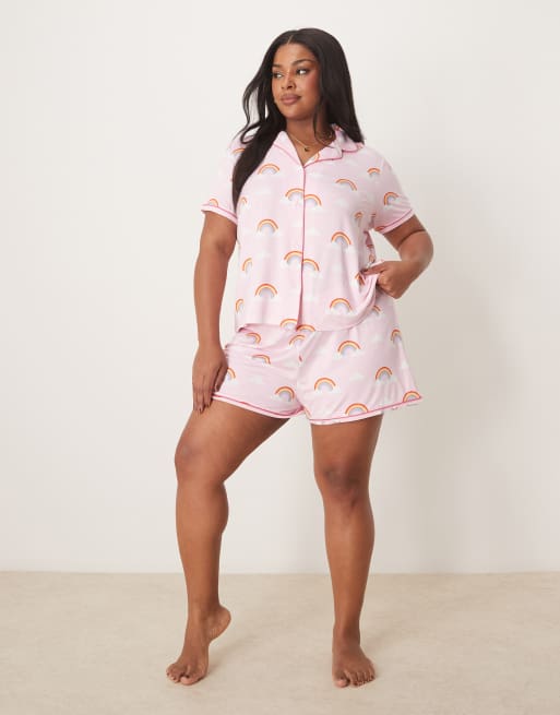 Urban Threads Curve - Pigiama con stampa di arcobaleni composto da pantaloncini e camicia a maniche corte con rever