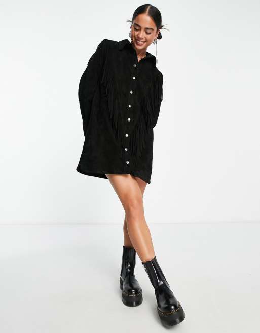 Urbancode - Vestito nero in vera pelle con frange
