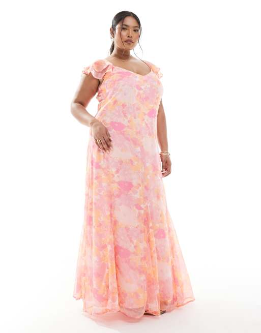 Vero Moda Curve - Smilla - Vestito alla caviglia rosa con stampa sfocata a fiori e maniche con volant