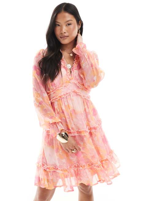 Vero Moda Petite - Smilla - Vestito corto punto smock rosa a fiori sfocati con volant