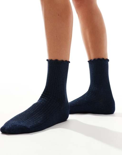 Vero Moda - Calzini glitterati blu navy con volant sui bordi