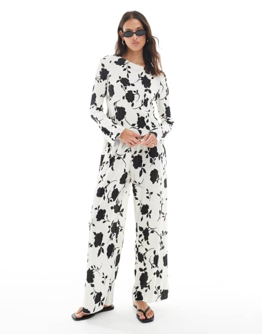 Vero Moda - Completo bianco e nero a fiori composto da top plissé a maniche lunghe e pantaloni a fondo ampio