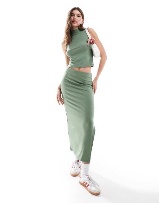 Vero Moda - Gonna lunga a colonna verde salvia a coste in coordinato