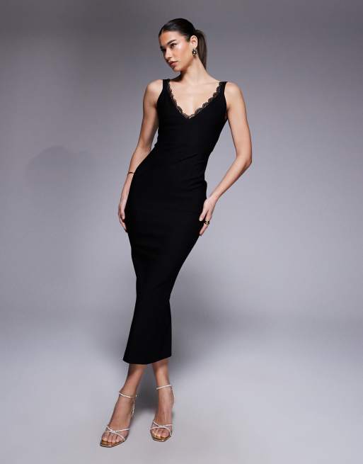 Vesper - Vestito lungo nero in bengalina con scollo a V e spalline con finiture in pizzo