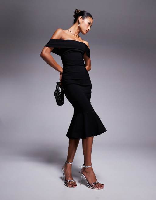 Vesper - Vestito midi in bengalina nero con scollo alla Bardot e fondo a coda di rondine