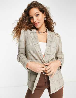 Vila - Blazer marrone a quadri con maniche a sbuffo