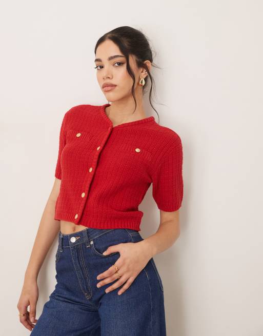 VILA - Cardigan rosso a maniche corte in maglia bouclé