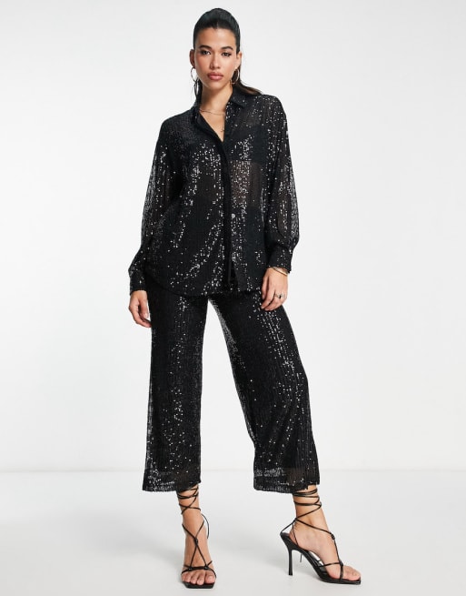 Vila - Coordinato con camicia e pantaloni in paillettes nero