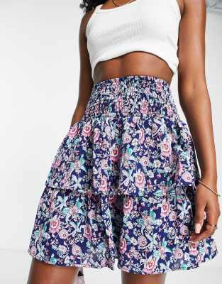 Vila - Gonna arricciata in vita blu navy a fiori con volant