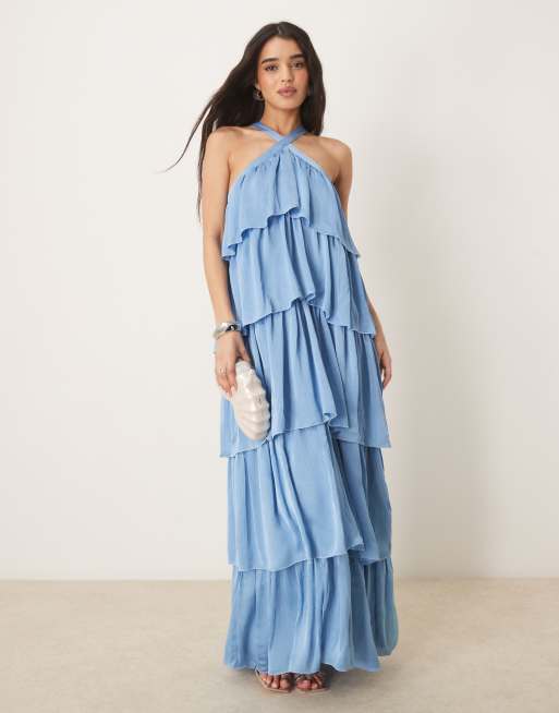 Vila - Vestito lungo a balze allacciato al collo con volant color blissful blue