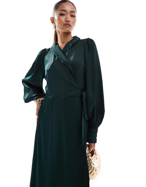 Vila - Vestito lungo a portafoglio in raso verde da damigella
