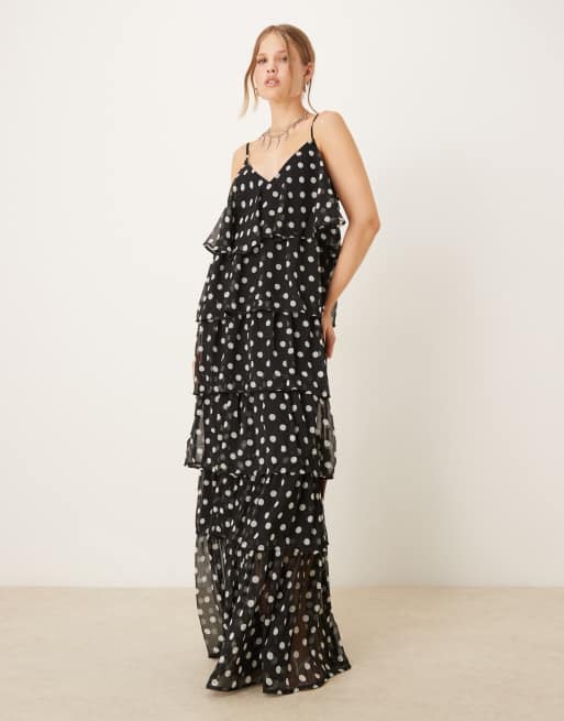 VILA - Vestito lungo nero a pois bianchi con volant