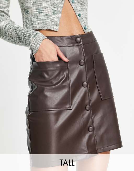 Violet Romance Tall - Minigonna in pelle sintetica marrone cioccolato con bottoni sul davanti