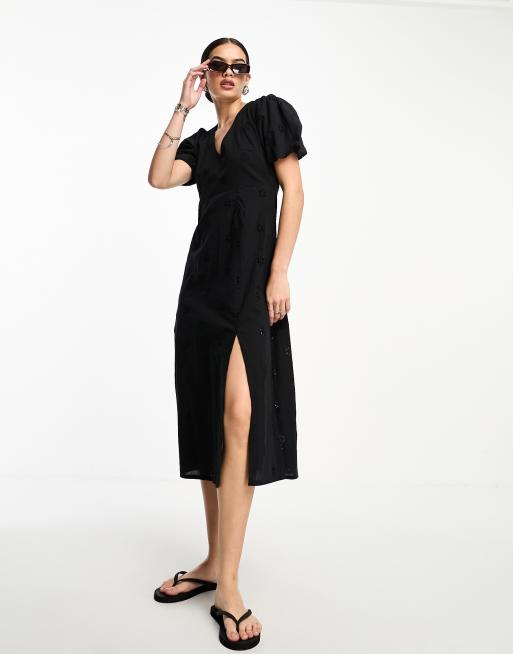 Violet Romance - Vestito midi nero in pizzo sangallo con maniche a sbuffo