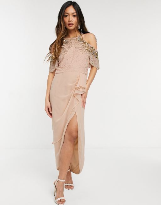 Virgos Lounge - Vestito midi avvolgente con spalle scoperte e decorazioni rosa cipria