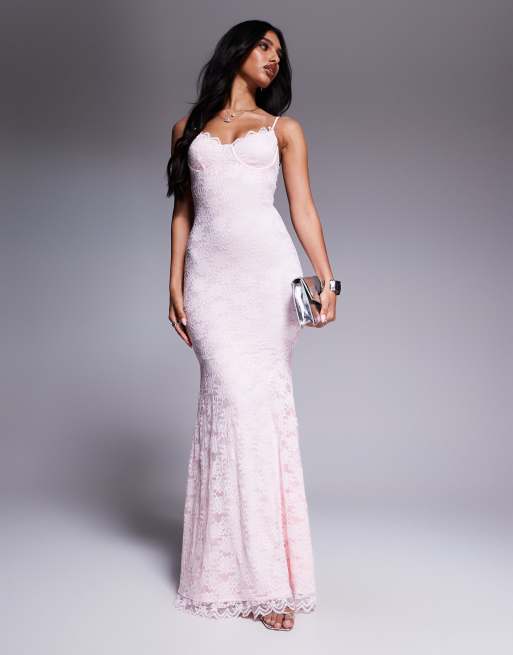 Wanderdoll - Leah - Vestito lungo con fondo a sirena in pizzo strutturato con spalline sottili rosa pallido