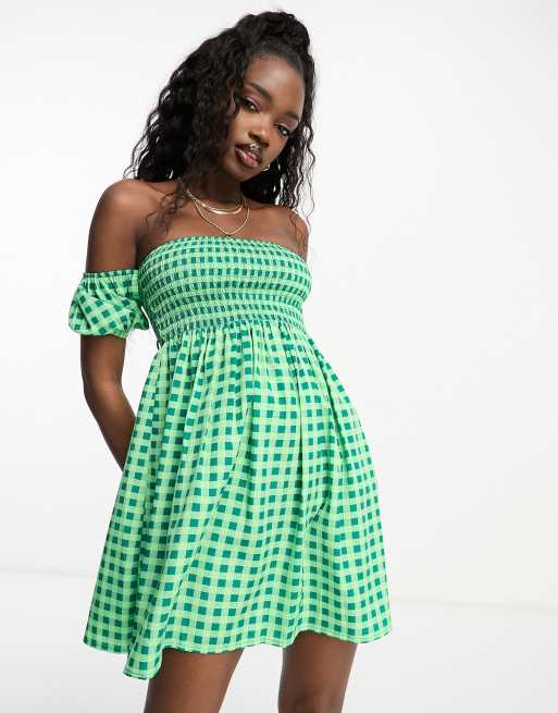 Wednesday's Girl - Vestito corto arricciato verde a quadretti con spalle scoperte