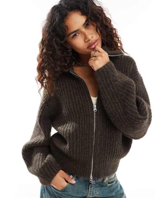 Weekday - Bea - Cardigan in misto lana marrone scuro mélange con zip e colletto oversize