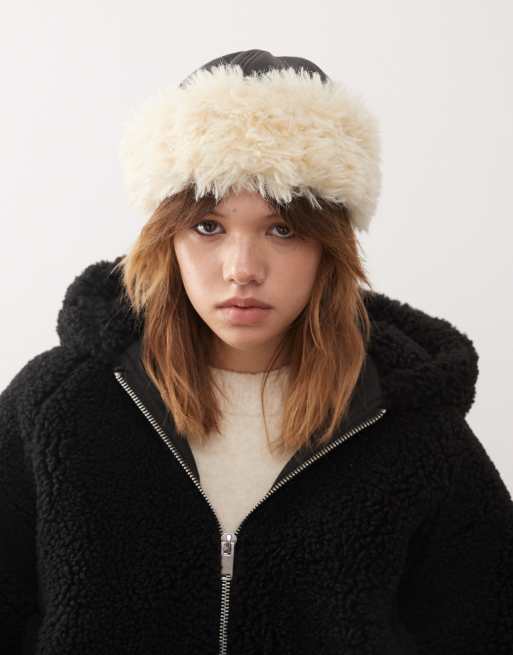 Weekday - Berretto con pelliccia sintetica nero e bianco sporco