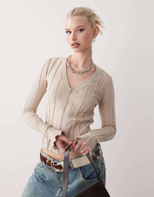 Weekday - Cardigan slim beige testurizzato con chiusura con zip