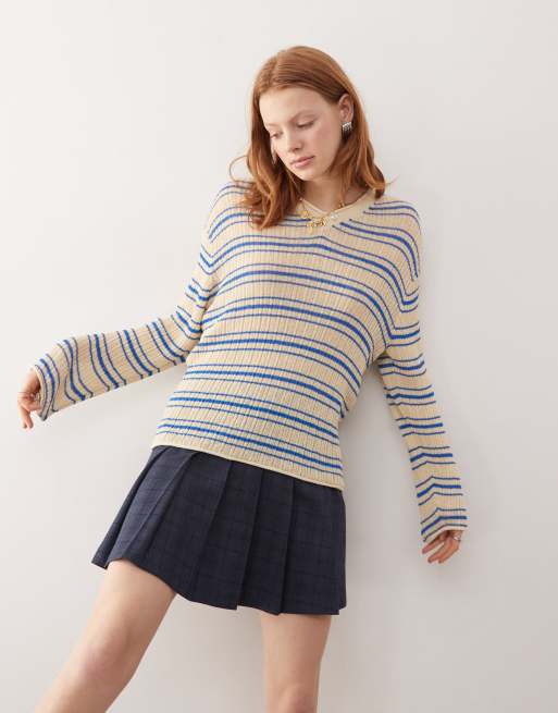 Weekday - Kai - Maglione bianco sporco a righe blu con scollo a V