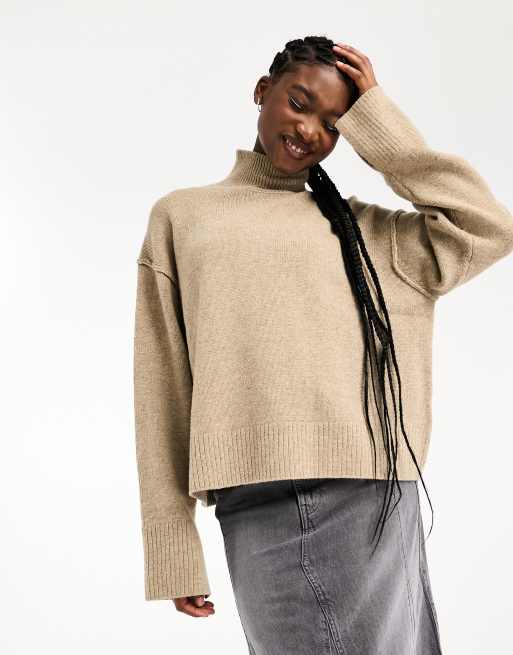 Weekday - Maggie - Dolcevita in lana beige mélange con cuciture a vista e maniche ampie